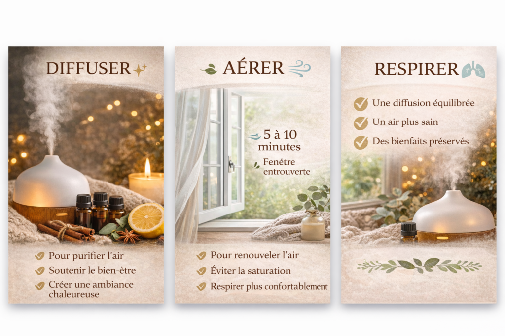 👉 Aérer après la diffusion ne sert pas à “enlever” l’odeur, mais à équilibrer l’air.